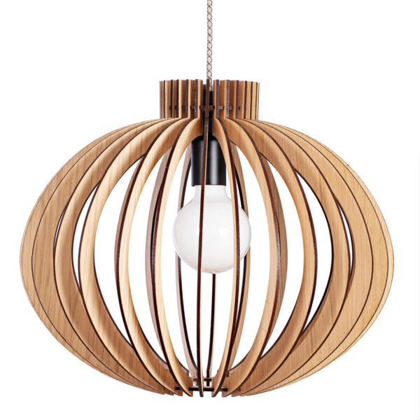 LYRA är en fantastisk taklampa i trä som kombinerar modern design med naturlig skönhet. Lampan är en unik Sfärisk pendellampa Trä, konstruerad av flertalet utskurna lameller (ribbor). Dessa ribbor skapar ett luftigt och dynamiskt mönster som låter ljuset sprida sig mjukt och behagligt i rummet. Den naturliga träfärgen ger en känsla av lugn och harmoni och lampans design gör den till en iögonfallande inredningsdetalj som passar perfekt i både moderna och mer traditionella miljöer.