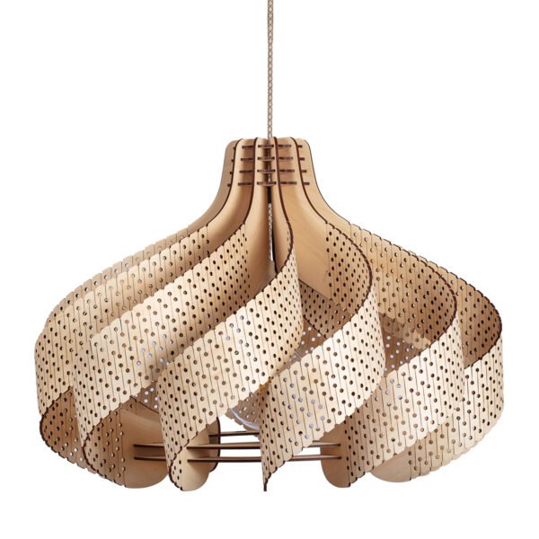 NOOR är en absolut fängslande pendellampa med ljusskuggspel som kombinerar modern design med en touch av organisk konst. NOOR utmärker sig med sin unika och intrikata konstruktion av vridna träband. Dessa band, tillverkade av trä, skapar en dynamisk och spiralformad silhuett som nästan ser ut att sväva lätt i luften.