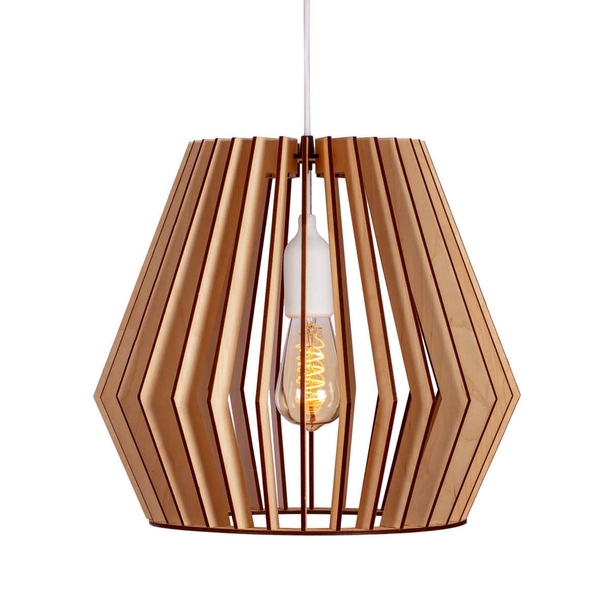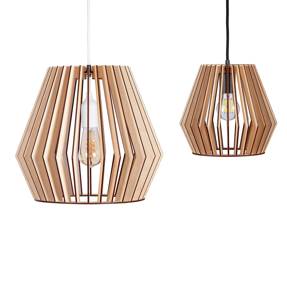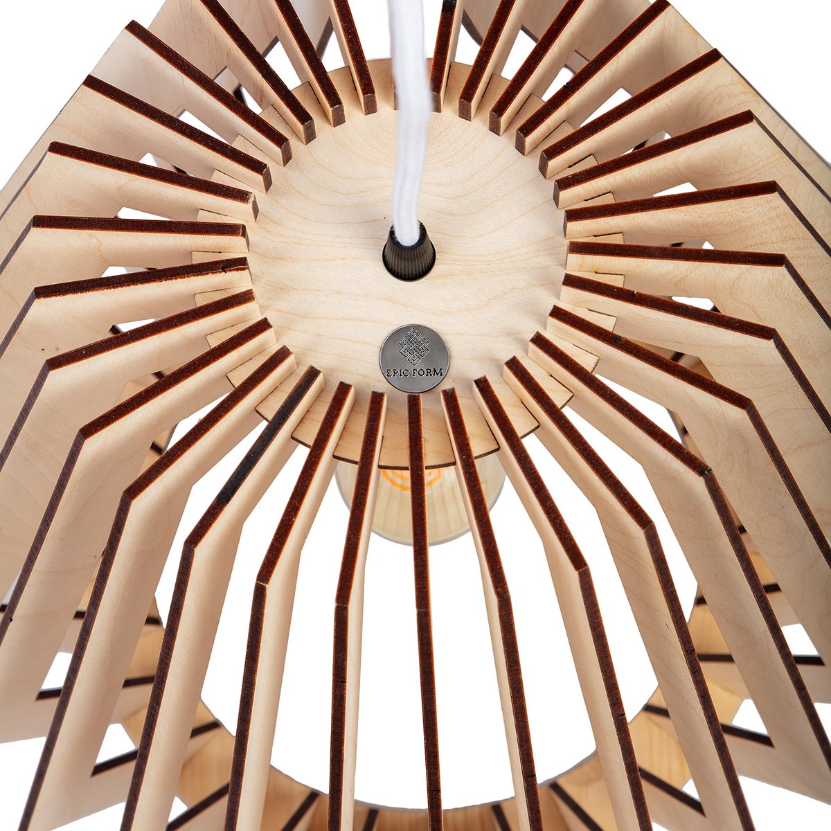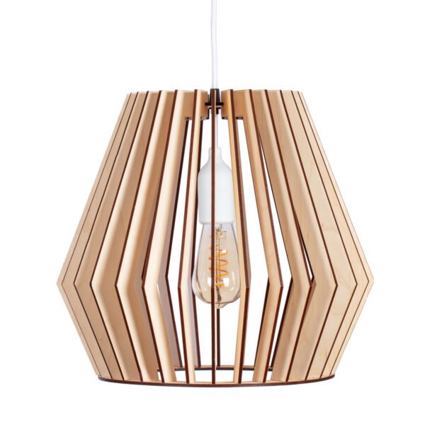 Denna eleganta taklampa är skapad av noggrant utvalda trälameller, som är smart sammansatta för att bilda en fascinerande, fasetterad silhuett. Träets ljusa toner och vackra ådring ger lampan en organisk känsla samtidigt som den skarpa, moderna formen tillför karaktär och dynamik till rummet. VEGA:s öppna konstruktion låter ljuset sprida sig fritt och skapa vackra mönster av ljus och skugga, vilket ger liv åt varje yta.